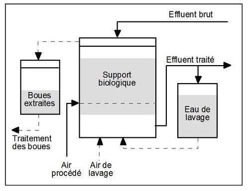 - les procédés à lit fixes, correspondant aux biofiltres immergés au sens strict, dans lesquels les matières en suspension de l'effluent et les boues en excès sont retenues au sein même de l'ouvrage, sans clarification ultérieure. Des lavages périodiques de l'ouvrage, à l'air et à l'eau, permettent de régénérer le matériau support. Les eaux de lavage chargées en matières en suspension sont soit renvoyées au niveau de la décantation primaire en tête d'installation, soit traitées directement par décantation ou flottation. Les procédés à lits fixes fonctionnent à flux d'eau ascendant ou descendant, et, selon le sens du passage de l'air, soit à contre-courant, soit à co-courant ;