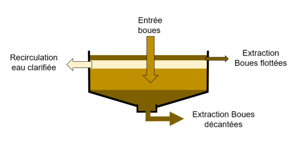 Les épaississeurs statiques sont de forme circulaire. Les boues sont introduites au centre, par la partie haute. Les matières décantent par gravité et forment un lit de boue concentrée dans la partie inférieure de l’ouvrage ; un pont racleur tournant permet de regrouper ces boues concentrées dans une fosse centrale d'où elles sont extraites. Les boues plus légères que l'eau peuvent également être écrémées en surface. Les eaux clarifiées sont extraites par un déversoir et réintroduites en tête de station (figure 1).
