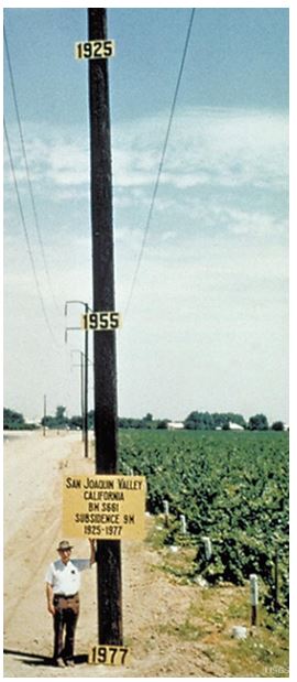 Figure 5 : Les prélèvements d'eau dans la nappe phréatique pour l'irrigation dans la vallée de San Joaquin en Californie ont entrainé une subsidence des terrains d'une dizaine de mètres en moins d'un siècle ; Source : Land Subsidence in the San Joaquin Valley.