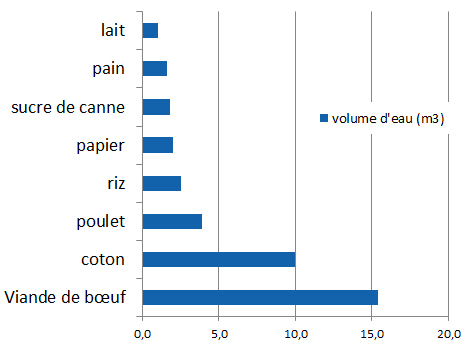 L’empreinte eau permet ainsi de calculer la quantité d’eau nécessaire pour produire un bien quelconque. Il faut par exemple 15 m3 d’eau pour produire 1 kg de bœuf ou encore 3 m3 d’eau pour 1 kg de riz (voir la figure 6).