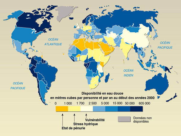 Le volume annuel d’eau douce disponible par habitant varie de quelques centaines de m3 par an dans des pays très « pauvres en eau », pour beaucoup situés en Afrique du Nord et de l'Est, à près de 100 000 m3 dans les pays « riches en eau », par exemple dans les pays d’Europe du Nord ou situés dans les zones équatoriales (voir figure 7).