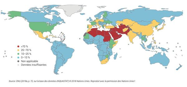 Toutefois cet indicateur ne reflète pas la totalité de la réalité de la rareté locale de l’eau douce selon l’usage qui en est fait. Par exemple, les pays qui ont une agriculture étendue utilisent beaucoup plus d’eau que ceux qui n’en ont pas, et a fortiori d’autant plus lorsqu’il y a de l’irrigation. De plus, la pénurie d’eau est souvent un phénomène saisonnier. Il est ainsi plus intéressant de représenter le stress hydrique par pays, calculé en pourcentage de l’eau douce utilisée sur l’eau douce disponible, indépendamment des usages de l’eau comme le représente la figure 8. Au total, plus de 2 milliards de personnes vivent dans des pays soumis à un stress hydrique (ONU, 2018).