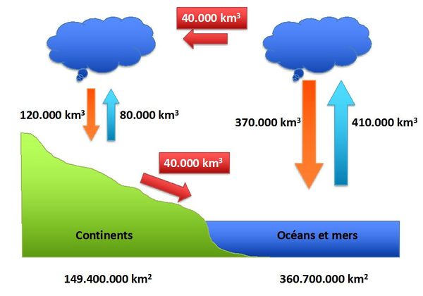 Figure 1 : L'analyse du cycle hydrologique montre que, contrairement à ce qui est souvent indiqué, plus des 2/3 des précipitations sur les surfaces continentales ont pour origine une eau qui s'est évaporée depuis une autre surface continentale et donc moins d'un tiers provient des océans.
