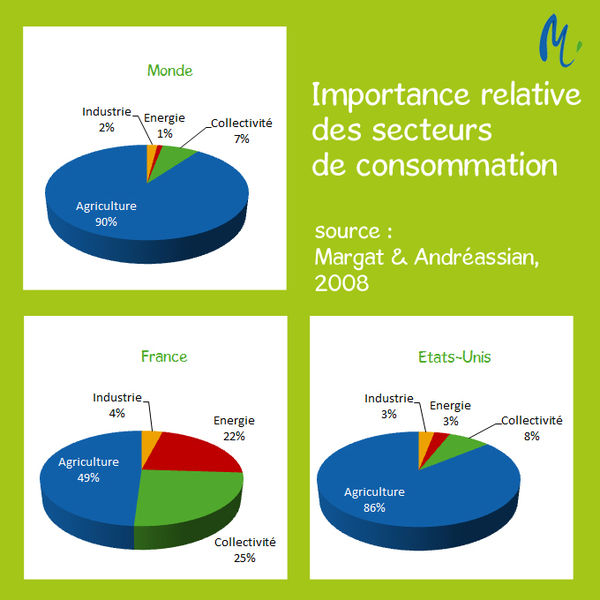 Cette différence est fondamentale car elle modifie totalement l’importance relative des différents secteurs d’usage de l’eau. En France, par exemple, l’irrigation ne constitue que le troisième secteur en importance pour les prélèvements, loin derrière la production d’énergie et même derrière la production d’eau potable, mais constitue le secteur le plus consommateur, en restituant à l’atmosphère l’essentiel de l’eau utilisée. Dans le monde et pour les mêmes raisons, la situation est similaire pour l’irrigation, qui représente 70% des prélèvements et 90% de la consommation nette. La figure 9, utilisant les données du centre d'information sur l'eau de 2012, illustre cette notion.