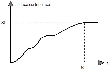 Le temps nécessaire à la pluie pour parcourir le trajet entre la courbe isochrone la plus éloignée de l'exutoire (cette courbe se réduit généralement à un point) est le temps de concentration $ t_c $. La surface est alors égale à la surface totale du bassin versant.