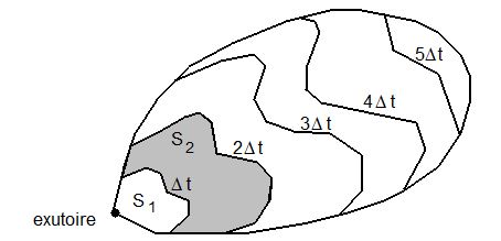 Une courbe isochrone (ou ligne isochrone) est définie comme l'ensemble des points d'un bassin versant tels que le temps mis par l'eau pour parcourir le trajet entre le point considéré et l'exutoire soit égal à une valeur donnée. On suppose en général que ce temps est constant, c'est à dire indépendant du débit instantané et de son évolution précédente. Si ces hypothèses sont vérifiées, tout bassin versant peut être décomposé en sous_bassins versants limités par des courbes isochrones. Sur l'exemple de la figure 1, le bassin versant a ainsi été décomposé en 6 sous-bassins, limités par des courbes isochrones séparées par des durées fixes et égales à $ Δt $. Par exemple la pluie précipitée sur la surface $ S_2 $, délimitée par les lignes isochrones $ Δt $ et $ 2.Δt $, arrivera à l'exutoire avec un temps de retard compris entre $ Δt $ et $ 2.Δt $.