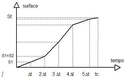 Il est possible de représenter l'expression (2) par un graphe aire/temps qui permet de calculer l'évolution de la surface théorique contribuant au ruissellement en fonction du temps écoulé depuis le début de la pluie (figure 2).