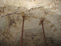 Amorce de fontis en toit d'une cavité anthropique à usage de cave de particulier, en lien avec la présence d'un système racinaire développé - commune de Vouvray-sur-Loir (72) A noter la présence d'étais sommaires mis en place par le propriétaire de la cave, ces étais n'assurent aucunement la stabilité à terme de la cavité. Étude source : PPRN mouvements de terrain - communes de Vouvray-sur-Loir et Château-du-Loir - Carte informative des événements Réf : 42.07.72.105 Date : février 2009 Client : DDE 72