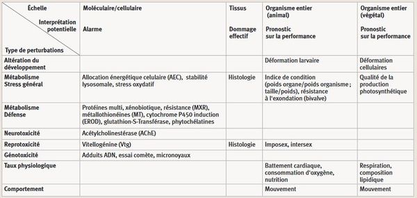 Le tableau de la figure 1, extrait de Garic et al (2010) montre la diversité des biomarqueurs utilisables en écologie des milieux aquatiques.