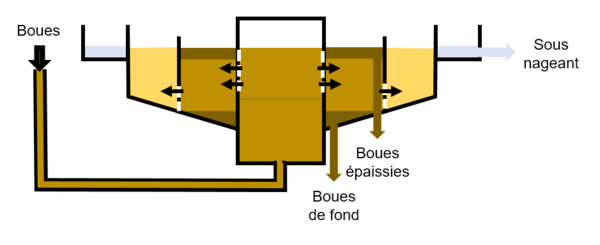 [[File:epaississement_des_boues_epaississeur_statique.PNG|600px|center|thumb|<center>''<u>Figure 1</u> : Schéme de principe d'un épaississeur statique.''</center>]]