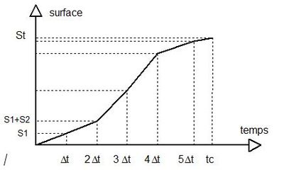 Il est possible de représenter l'expression (2) par un graphe aire/temps qui permet de calculer l'évolution de la surface théorique contribuant au ruissellement en fonction du temps écoulé depuis le début de la pluie.